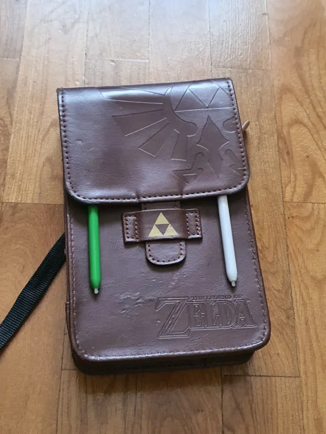 Detalles del productoFunda de estilo cartera para Nintendo con temática de The Legend of Zelda. Presenta un diseño en relieve del emblema de la Trifuerza y el logo del juego, presenta marcas de uso pero nada destacable ni arañazos grandes, está en excelente estado, incluye los 2 lapizes de la espada y el escudo.