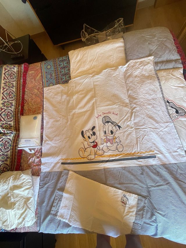 Detalles del productoConjunto de funda nórdica infantil de Disney, ideal para cunas. Incluye funda nórdica, nordico, sabanas, chichonera y funda protectora impermeable. Los artículos están en buen estado