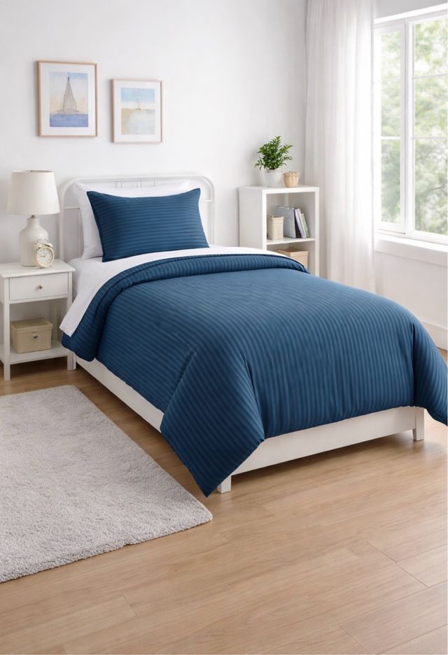 Amazon Basics Juego de Funda nórdica Cama 80/90 de Microfibra, 2 Piezas, Funda de edredón 135 x 200 cm y 1 Funda de Almohada 50 x 80 cm, Azul Marino, Rayas.