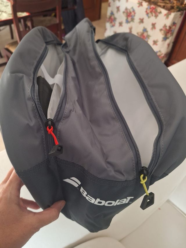 Funda para pala de pádel de la marca Babolat. Es de color gris y tiene un diseño moderno. - Cremalleras con tiradores. - Logo de la marca visible.