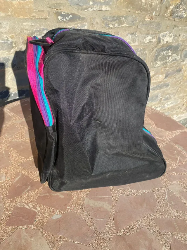 Funda para transportar botas de esquí o de montaña. Es negra con detalles en rosa, morado y turquesa. - Cremallera principal. - Asa para colgar.