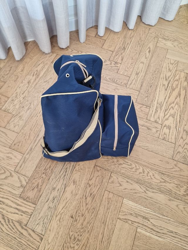 Funda para botas y casco, sin estrenar. - Color azul marino. - Ribetes en color beige. - Cierre con cremallera.