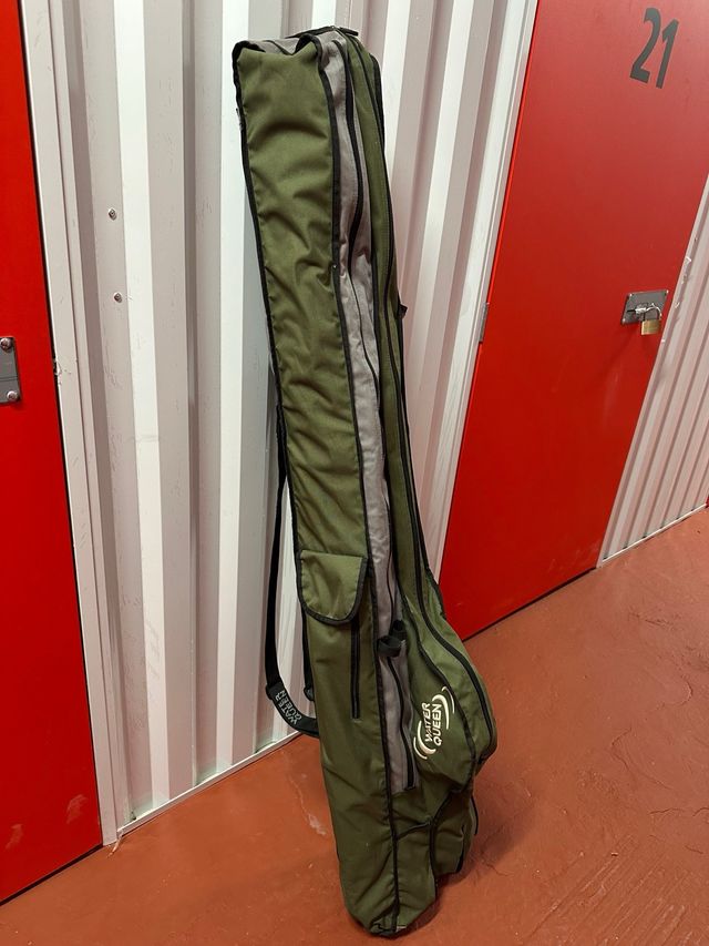 Detalles del productoFunda de color verde para transportar cañas de pescar. Cuenta con un diseño resistente y compartimentos adicionales.