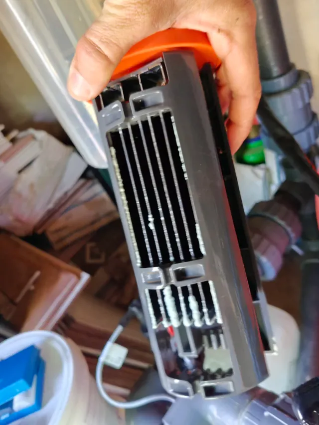 Funda de plástico gris con detalles naranjas. - Diseño con rejillas. - Pieza de repuesto o accesorio.