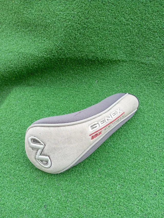 Detalles del productoFunda para palo de golf Gene 3 DX Ironwood, diseñada para palos híbridos. Su diseño combina tonos grises y beige, con detalles en rojo. Presenta desgaste y algún agujero se puede ver en fotos