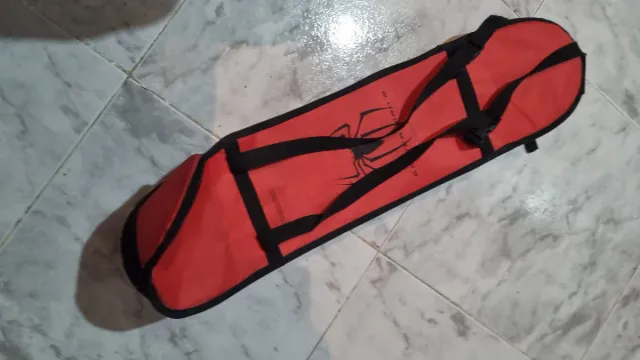 Funda de color rojo con detalles en negro, ideal para transportar tu patinete o monopatín. - Diseño con estampado de araña. - Asas para facilitar el transporte.