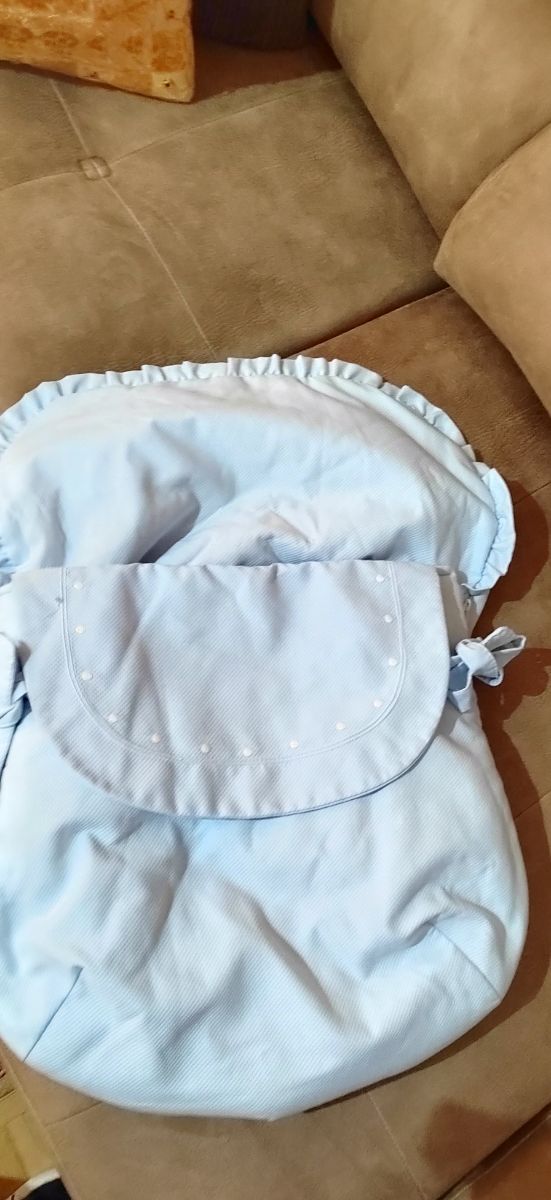 Detalles del productoFunda para silla de bebé en color azul claro, con un diseño de rayas finas y detalles de pequeños puntos blancos.
