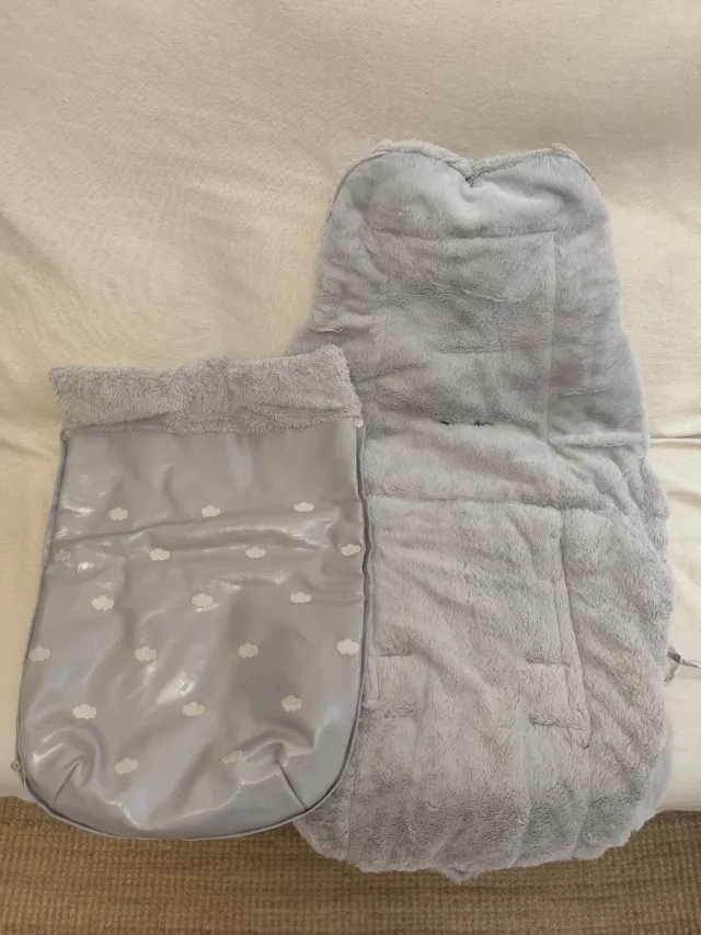 Detalles del productoFunda acolchada para silla de bebé, ideal para mantener a tu pequeño abrigado y cómodo. El diseño exterior presenta un patrón de nubes blancas sobre fondo gris.