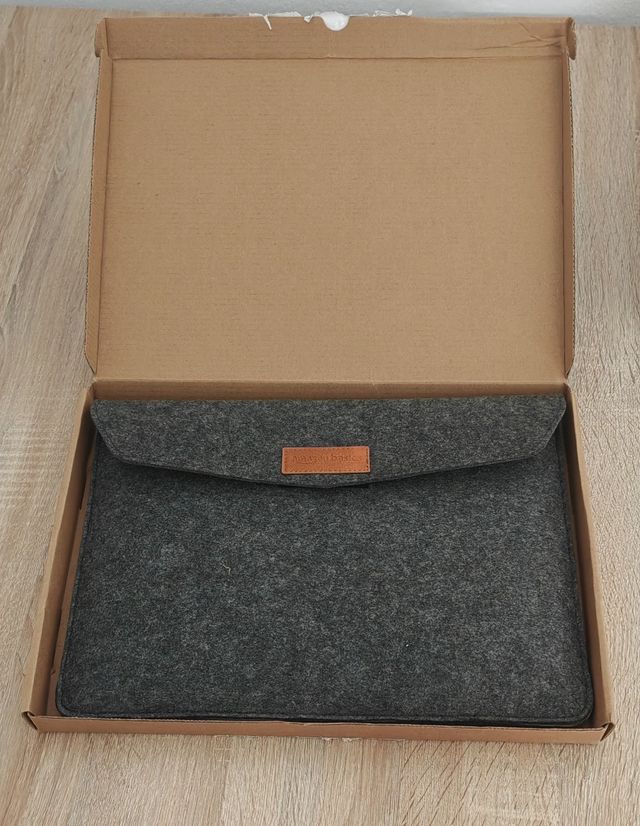 Funda de fieltro Amazon Basic. Contiene dos compartimentos. Dos bolsillos auxiliares. Dimensión de 33 cm.