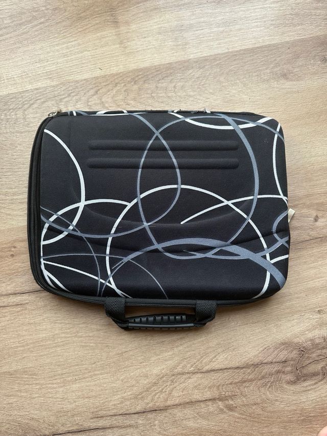 Detalles del productoFunda para ordenador portátil o tablet, ideal para proteger tu dispositivo. Es de color negro con un diseño de líneas curvas en blanco y gris.