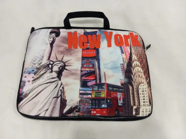 Detalles del productoFunda para portátil con diseño de Nueva York, mostrando la Estatua de la Libertad y el skyline.