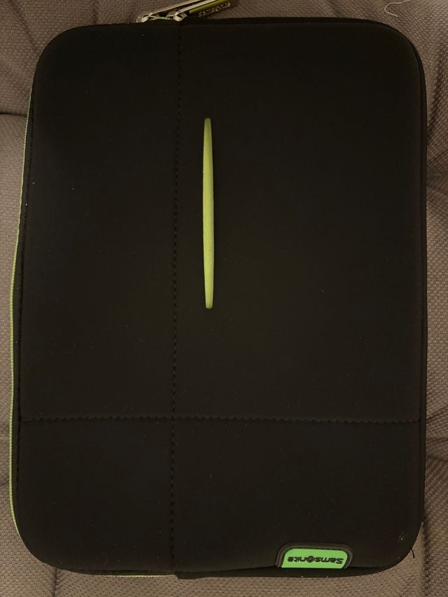 Funda protectora para portátil o tablet. - Color negro con detalles en verde lima. - Cremallera para cierre. - Diseño acolchado. Medidas: 28x20cm