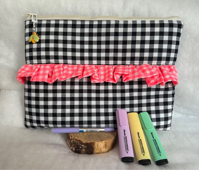 Detalles del productoPreciosa funda para portátil hecha a medida. Es negra y blanca de cuadros vichy y tiene un volante .Es una funda única y elegante, ideal para proteger tu ordenador y darle un toque de estilo.