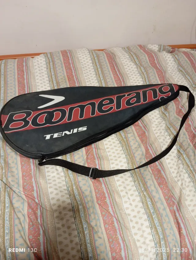 Funda para raqueta de tenis marca Boomerang con años de uso pero en condiciones aceptables - Color negro con detalles en rojo. - Correa ajustable