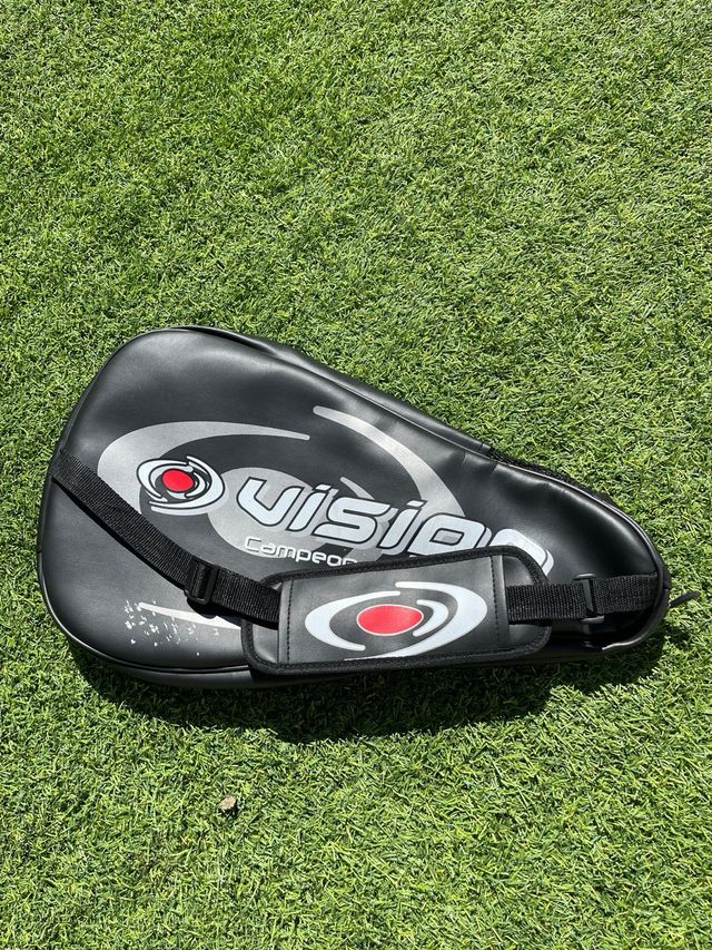 Detalles del productoFunda para raqueta de pádel de la marca vision. En muy buen estado, salvo un pequeño (muy pequeño) roto en el interior (tal y como puede observarse en detalle en la última fotografía) pero que no perjudica en su utilización ni estética.