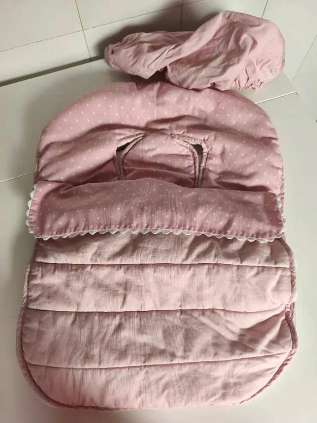 Detalles del productoFunda para silla de paseo o carricoche universal en color rosa con estampado de lunares blancos. Incluye capota.