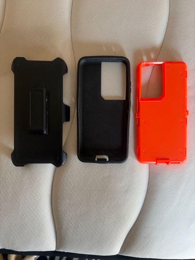 Funda protectora para Samsung Galaxy S21 Ultra en dos partes. - Parte interior negra. - Parte exterior naranja. - Diseño resistente.