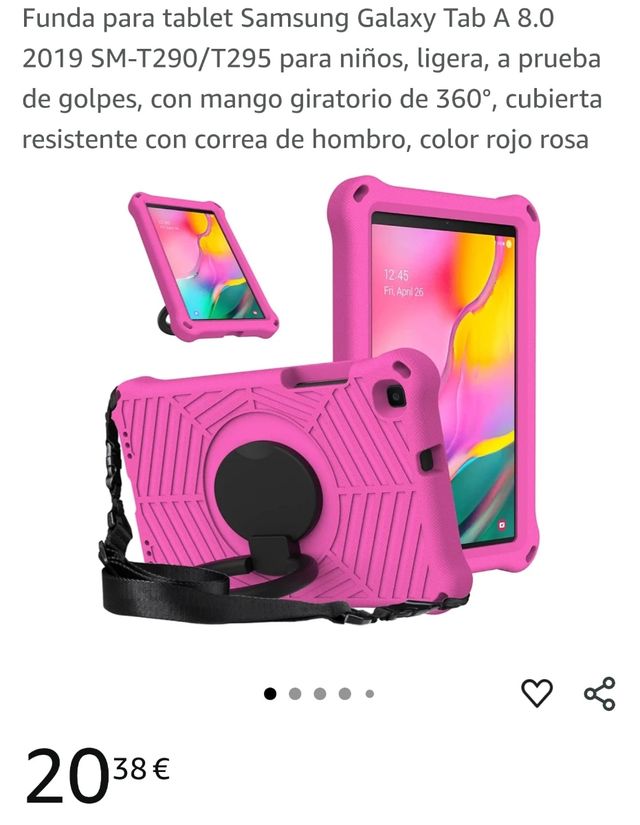 Detalles del productoFunda rosa para Samsung Galaxy Tab A 8.0 (2019 SM-T290/T295). Es ligera y resistente a golpes, con rotación de 360º. Incluye asa de hombro. Está en perfecto estado.
