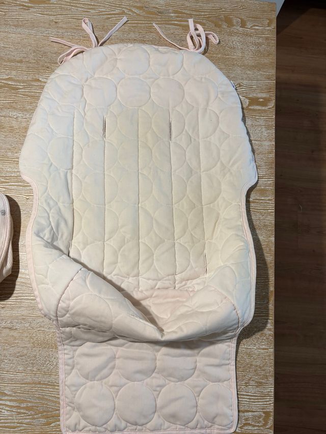 Detalles del productoFunda acolchada para silla de paseo en un suave color rosa. El diseño presenta un patrón de círculos acolchados y bordes a juego.