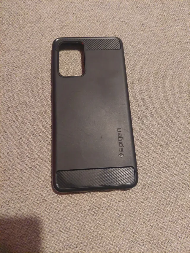Funda protectora para Samsung Galaxy A52. - Diseño con textura de fibra de carbono en los bordes. - Acabado mate. - Logo de Spigen visible.