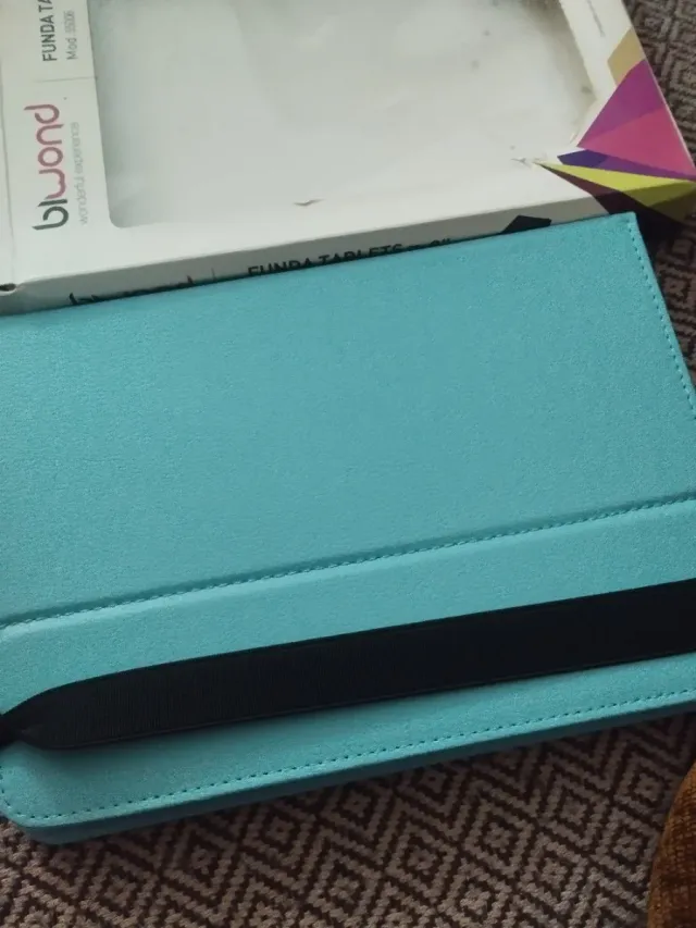 Funda para tablet en color azul, con un diseño elegante y funcional. - Material exterior con textura. - Banda elástica negra para sujeción.
