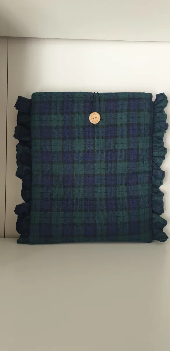 Detalles del productoFunda de tela con diseño de cuadros escoceses, ideal para proteger libros, tablets o lectores electrónicos.