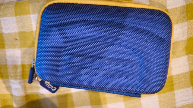 Funda de transporte para disco duro externo. - Color azul con ribete amarillo - Cremallera.