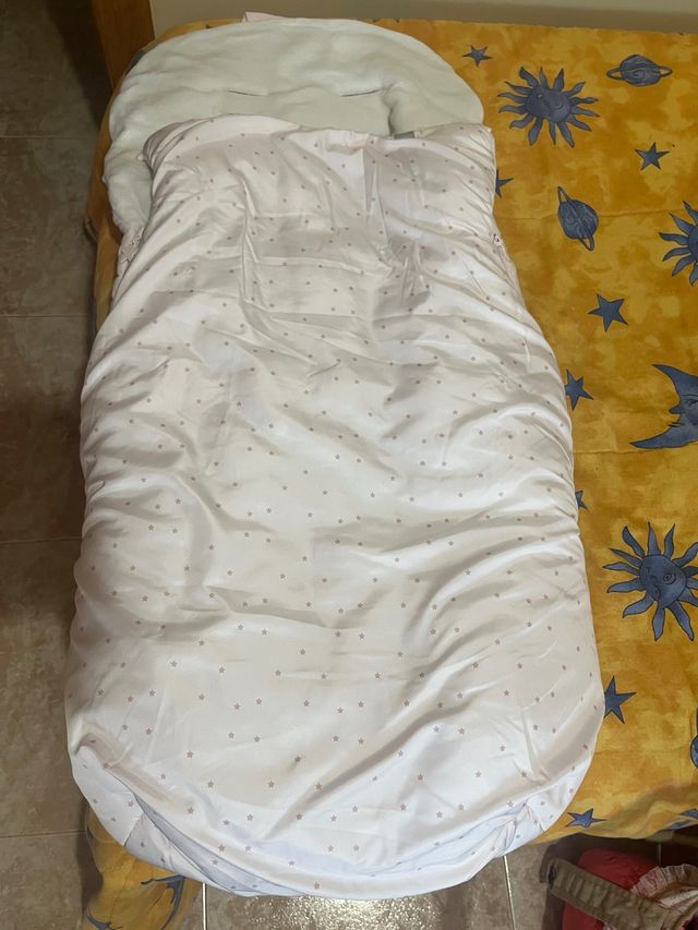 Detalles del productoFunda acolchada para carrito de bebé, con un diseño de estrellas en tono rosa pálido sobre fondo blanco. La parte superior es de un suave tejido blanco.