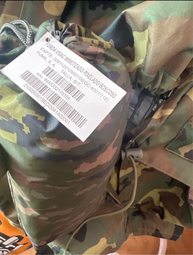 Funda de vivac del ejército español, nueva a estrenar. Ideal para actividades al aire libre. - Nueva con etiquetas. - Diseño de camuflaje. - Talla única.