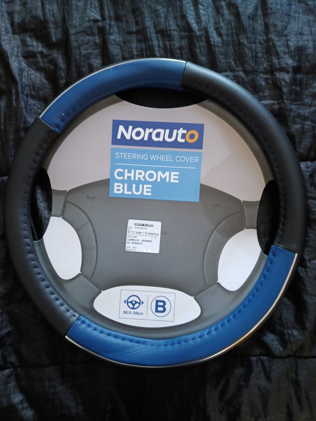 Funda para volante de coche de la marca Norauto. - Color: Cromado y azul. - Diseño moderno y deportivo. - Tamaño: 36.5-38cm.