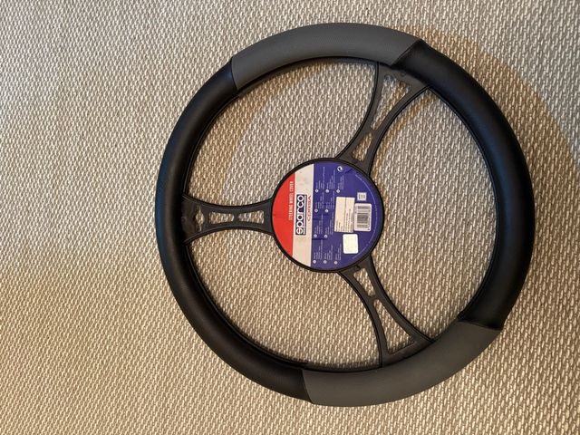 Funda para volante de coche Sparco. - Color negro y gris. - Material de tacto agradable efecto piel. - Diseño deportivo. - Para volantes de 37-38 cm de diámetro