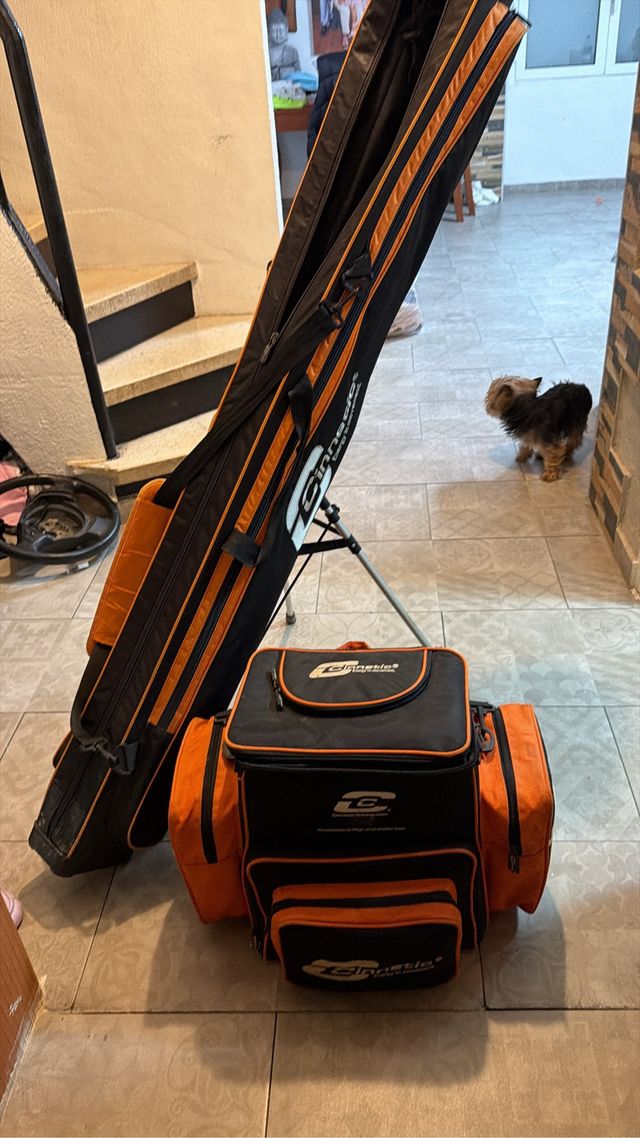Conjunto de funda y bolsa para pesca. - Funda de gran capacidad para cañas. - Bolsa de transporte con múltiples compartimentos. - Diseño en color negro y naranja.