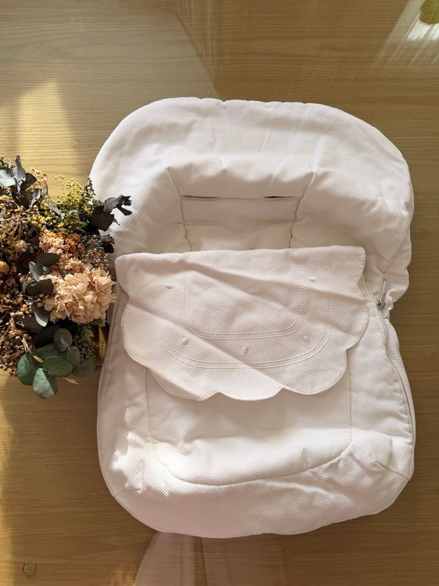 Detalles del productoFunda y saco de tejido piqué en color crudo para carrito de bebé Masicosi. El saco tiene un diseño acolchado con un borde festoneado con aberturas para arnés. Muy cuidado y con poco uso.