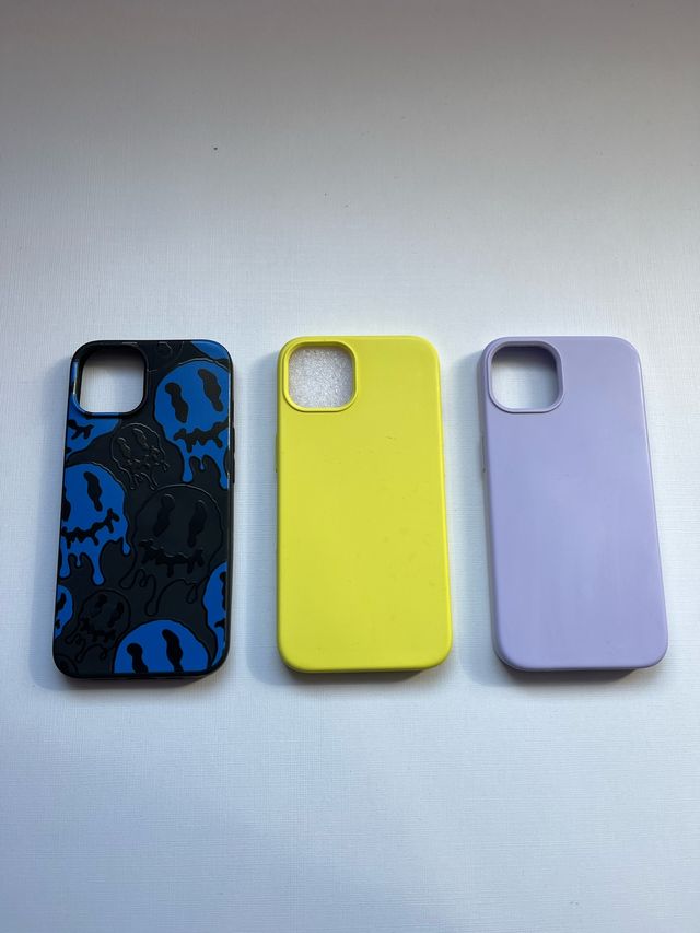 Lote de tres fundas para iPhone 13. - Funda con diseño de calaveras sonrientes en negro y azul. - Funda lisa de color amarillo. - Funda lisa de color lila.