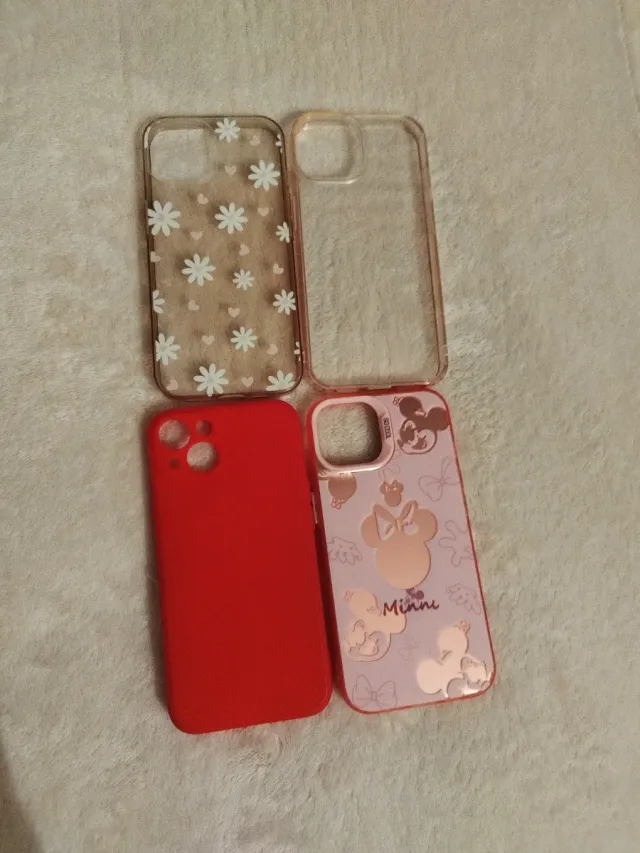 Detalles del productoLote de cuatro fundas para iPhone 15. Incluye dos fundas transparentes con diseño de flores y corazones, una funda roja lisa y una funda con diseño de Minnie Mouse.