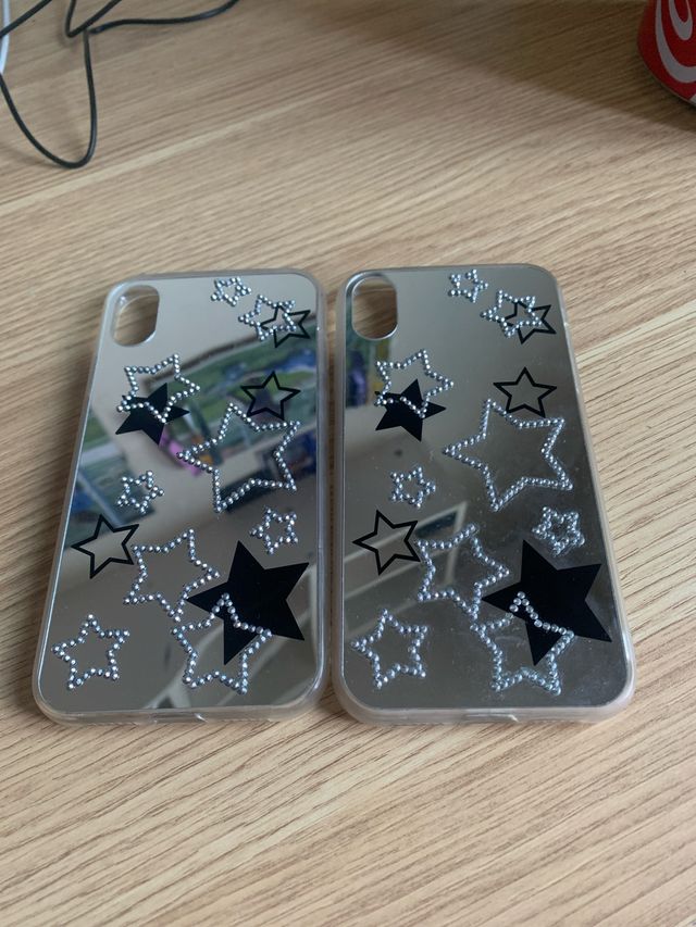 Detalles del productoDos fundas para iPhone XR. Son de espejo con estrellas negras y brillantes. Ideales para darle un toque de brillo a tu móvil.