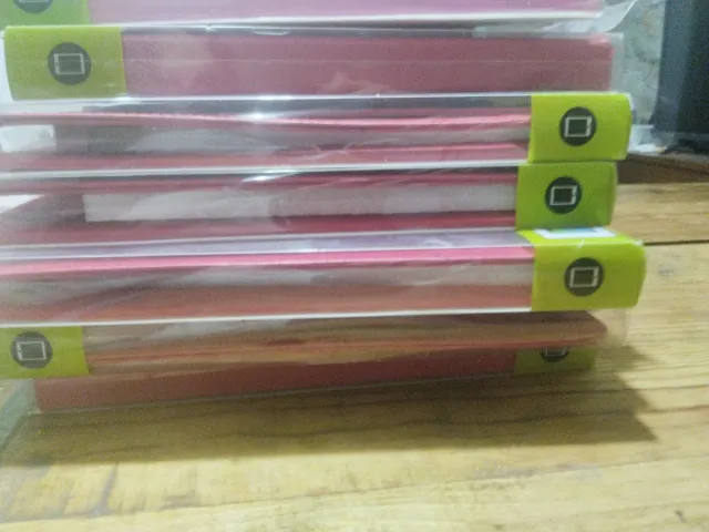 Conjunto de diez fundas para tabletas. - Color rojo. - Diseño con borde verde y símbolo cuadrado.