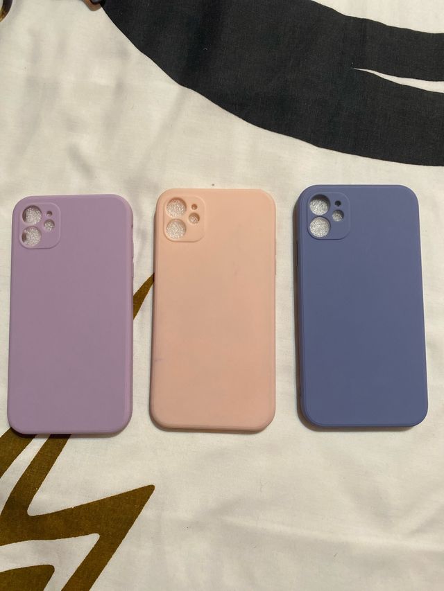 Tres fundas para iPhone 11 en tonos pastel. Protegen tu teléfono con estilo. - Funda lila. - Funda melocotón. - Funda azul pastel.