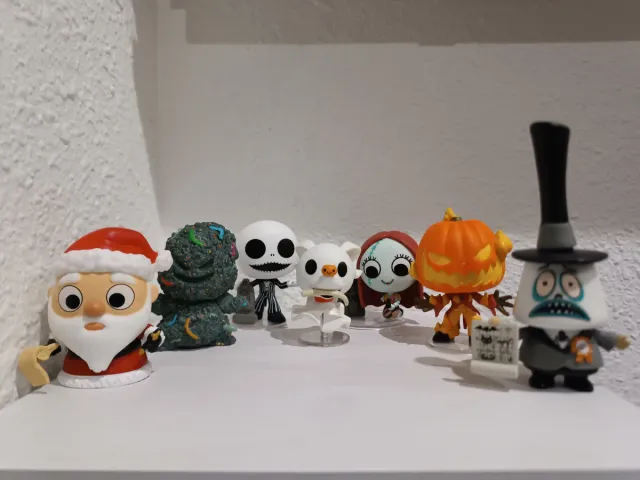 Colección de figuras Funko Mystery Minis de Pesadilla Antes de Navidad. Incluye varios personajes icónicos de la película.