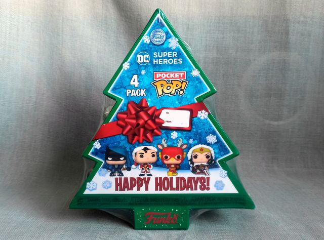 Detalles del productoFunko Pocket Pop DC Holiday. Pack de 4 figuras de personajes de DC (Superman, Batman, Flash y Wonder Woman) vestidos de Navidad. Viene presentado en una caja con forma de abeto. Ideal como regalo de Navidad. NUEVO Y PRECINTADO