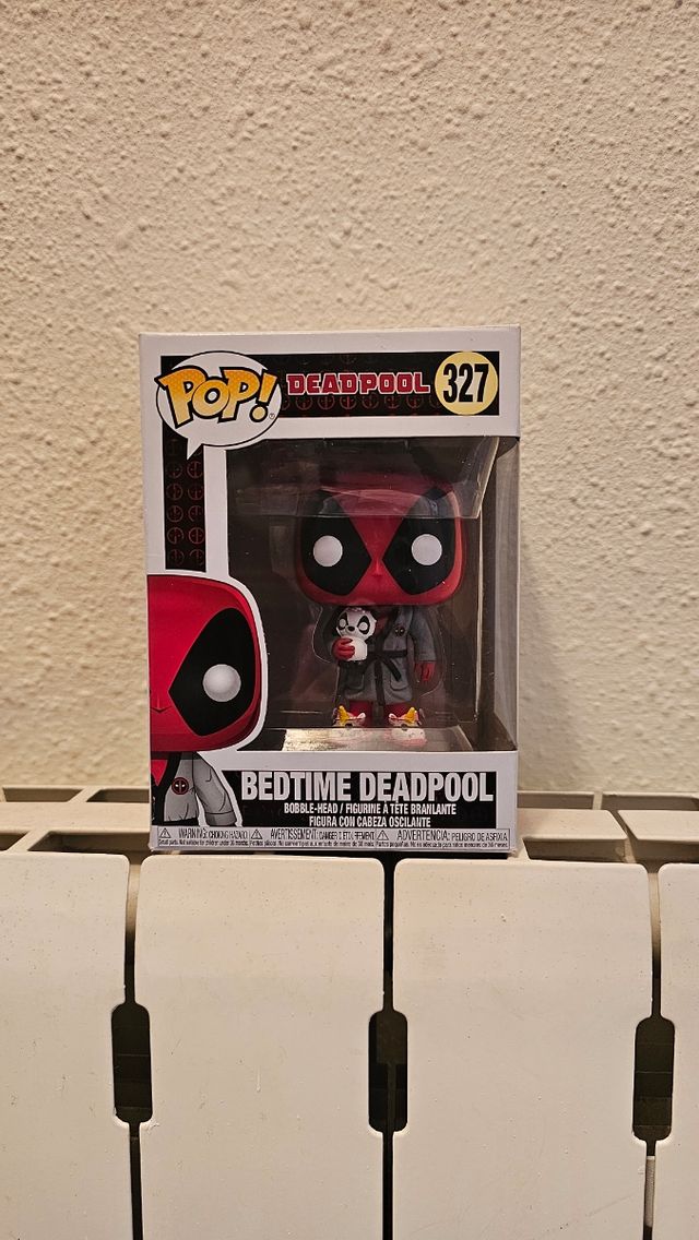 Figura Funko Pop! de Deadpool en su versión Bedtime. - Personaje: Deadpool. - Número de colección: 327. - Diseño: Deadpool con pijama y taza.