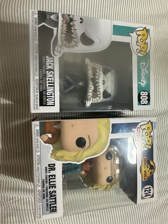 Dos figuras Funko Pop! coleccionables. - Funko Pop! Disney #808 Jack Skellington. - Funko Pop! Movies Jurassic World #1214 Dr. Ellie Sattler.