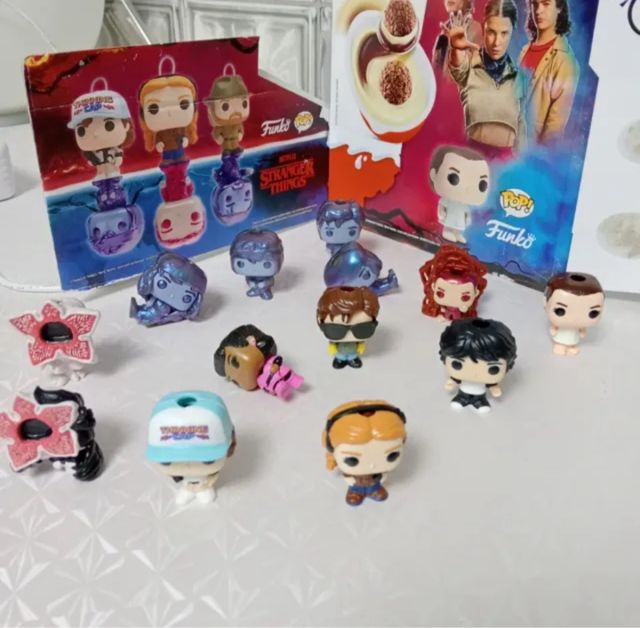 Detalles del productoColección de figuras Funko Pop! de Stranger Things, provenientes de Kinder Sorpresa. Cada figura representa un personaje de la serie.