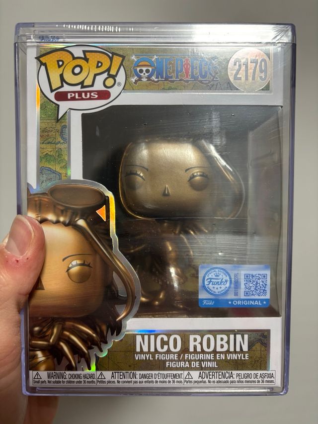 Figura Funko Pop de Nico Robin, número 2179, de la serie One Piece. - Edición especial. - Diseño en color dorado. - Incluye caja original.