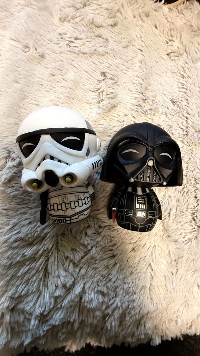 Dos figuras Funko Pop de Star Wars, un Stormtrooper y Darth Vader. - Figura de Stormtrooper. - Figura de Darth Vader.