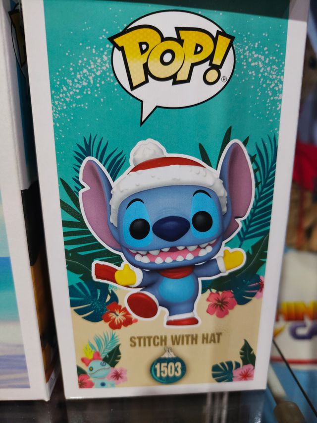 Figura coleccionable de Stitch con gorro navideño. - Personaje: Stitch. - Número de modelo: 1503. - Diseño temático de verano con flores tropicales y gorro de Papá Noel.