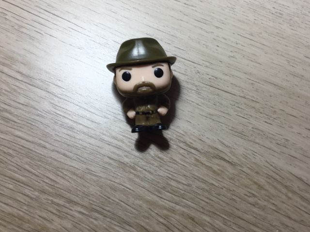 Figura coleccionable de Jim Hopper de Stranger Things, proveniente de un Kinder Joy. - Diseño detallado del personaje. - Gorra y traje característicos.