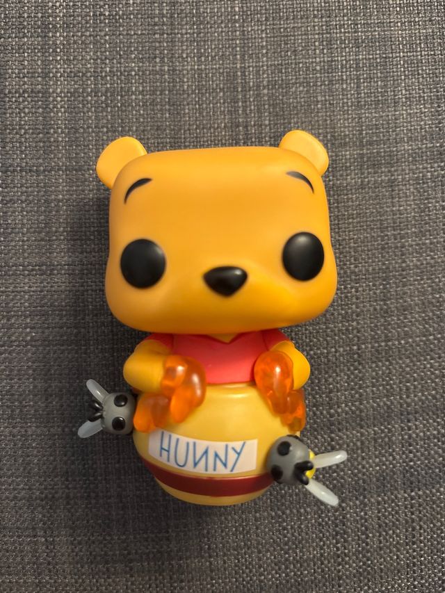 Figura coleccionable de Winnie the Pooh, con su icónico tarro de miel y abejas. Se vende sin su caja Original. Estado nuevo.