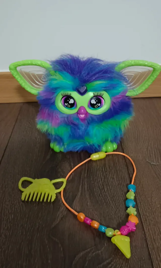 Este Furby Galaxy en tonos morado, azul y verde. - Orejas verdes brillantes. - Ojos grandes y expresivos. - Incluye un collar con cuentas de colores y un pequeño peine.