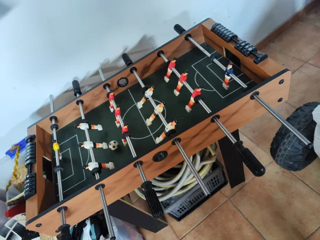 Futbolín de madera con campo de juego verde. - Barras de metal con jugadores. - Marcadores en cada extremo. - billar - pimpón